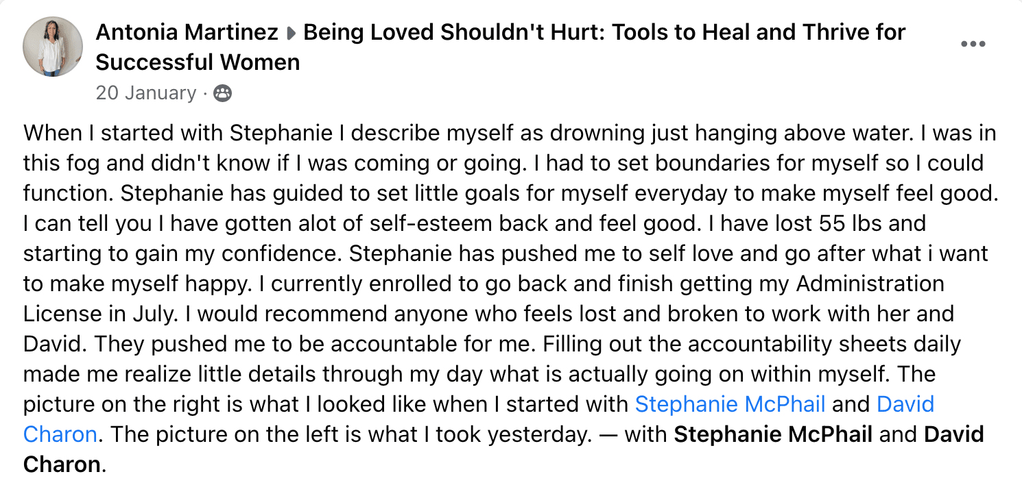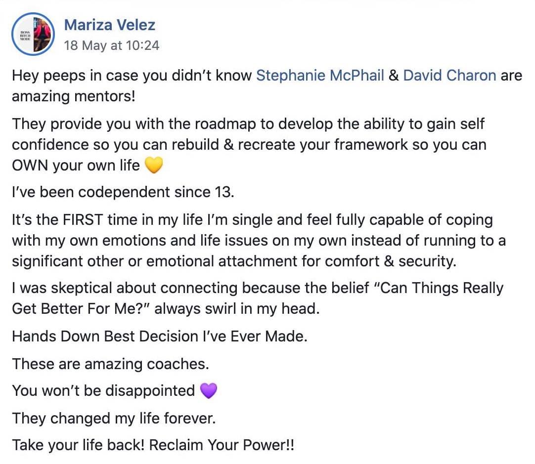 “I just want to say I am so glad I decided to get help from Stephanie McPhail and David Charon. This is an awesome program, don’t sit on the fence, you are worth it!”