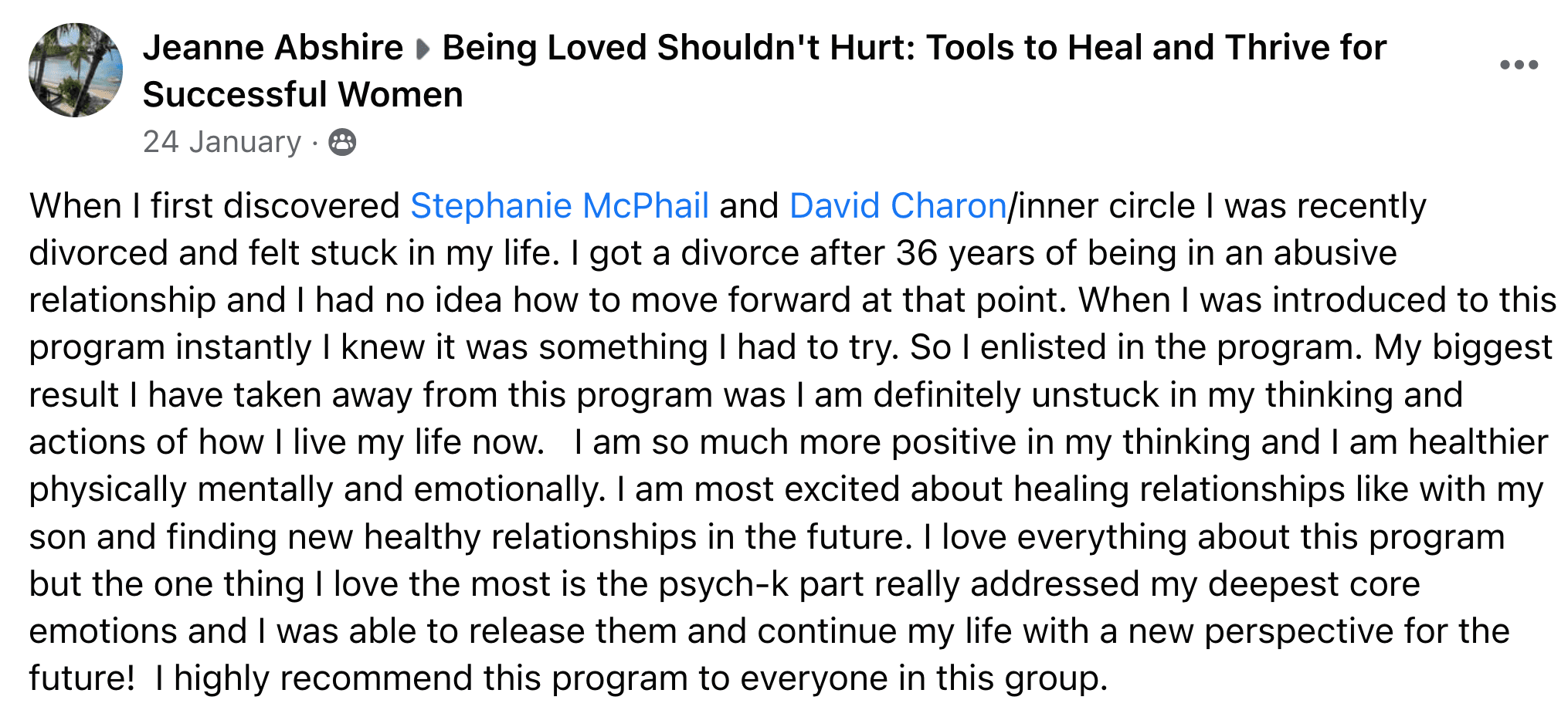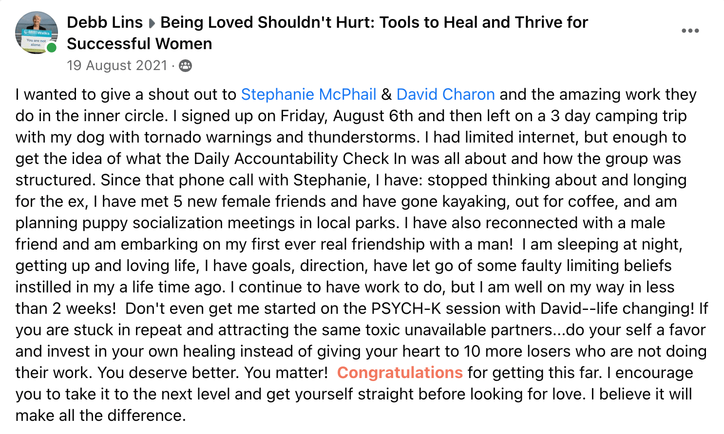 “Thank God for this group, especially the Inner Circle which I call my Tribe… it was SO WORTH IT and possibly the BEST THING I’ve ever done to help my healing.”